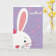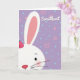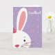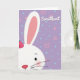 The front design shows a close-up white rabbit 🐰 placed slightly off-center, with its head and one long ear filling the left side as if it’s leaning in to greet someone. A dark, gentle eye, a small pink nose, rosy cheeks, and fine whiskers give the face a tender, friendly look that reads like quiet affection. A bright fuchsia bow sits near the top of its head, adding a sweet accent against the soft fur. The background is a pale lavender field sprinkled with pastel blue and pink polka dots, with curling pink spirals that drift around like little daydreams 🌷. In the upper right, the word “Sweetheart” appears in white cursive-style lettering, spaced away from the rabbit so it feels like it’s being said across the page. The rounded shapes and light pastel colors keep everything soft and cozy, like a gentle note shared between close friends. The rabbit’s ear stretches upward along the left edge while the dots and spirals scatter across the lavender backdrop toward the top right.