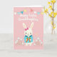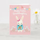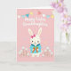 This card shows a sweet white bunny centered on a blush-pink background, wearing a pink bow and a light blue jacket while cuddling two orange root vegetables close to its chest 🐰. The bunny’s rosy cheeks and long lashes, along with its gentle, slightly shy gaze, add a tender, affectionate feel like a warm hug meant for close family. Near the top, the words “Happy Easter Granddaughters” appear in white lettering, set clearly above the character. A garland of small triangular flags stretches across the upper edge in soft pastel blue, yellow, coral, and white, with a few simple patterns mixed in. A smaller bunny peeks out from behind the bunting as if sharing a quiet, friendly hello 🐇. Along the bottom, stylized white daisies with sunny yellow centers and green stems form a cheerful border. Tiny light-blue and pale-yellow circles are sprinkled around the scene, and the bunting, peeking bunny, and flowers sit neatly against the soft pink field.