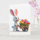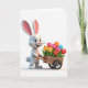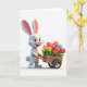This card shows a bright white cartoon rabbit on a plain white background, with long ears lined in pink and big blue eyes that seem to glance toward the flower cart like it’s sharing a sweet surprise 🐰. The rabbit wears an open-mouthed smile with two front teeth, a rosy nose, and fine whiskers, giving it a friendly, affectionate look. It’s posed mid-step as it pushes a rustic wooden handcart, as if delivering flowers to someone special. The cart is piled high with tulips in fuchsia, orange, yellow, and soft sky blue, with leafy green stems spilling over the edges 🌷. Soft, diffused lighting adds gentle shine to the rabbit’s smooth finish and brings out the rounded shapes in the petals. A short Easter greeting sits near the top in a simple, rounded font, colored in a light spring green that stands out against the white space. The wooden cart shows visible grain lines and a small wheel, with tulip blossoms clustered thickly above the handle.
