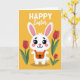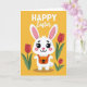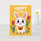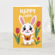 This card shows a friendly white bunny 🐰 centered on a golden-yellow background, looking straight ahead with big black eyes, tiny lashes, rosy cheeks, and a small pink nose. Its long upright ears frame its face, and the direct gaze feels like a gentle hello shared between close friends. A small orange satchel crosses its chest on a diagonal, hinting at a sweet little errand and adding a cozy, companionable touch. On both sides, two red tulips 🌷 rise evenly with green stems and deep red petals, like they’re standing guard beside the bunny. The bright backdrop makes the white fur and tulips stand out, like a sunny morning scene. Across the top, the text reads “HAPPY Easter,” with “HAPPY” in dark, simple uppercase letters and “Easter” in a flowing, decorative style just beneath it. The satchel includes a small dark rectangular buckle near the front, and the tulips sit at equal height on either side of the bunny.