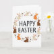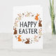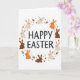 This card features a digital illustration with a spring greeting set in dark lettering at the center of a wide white background. The words sit as the main focal point, with the text laid out in a straightforward, easy-to-read style. Around the message, a ring of cute rabbits forms a loose wreath, their bodies angled toward one another as if sharing a quiet, friendly moment 🐰. The rabbits are shown in soft cream, warm orange, and deep brown, each sitting calmly with ears tilted in different directions and small smiles that suggest gentle affection. Between them, tiny leaf sprigs in dark brown and scattered reddish-orange dots fill the gaps like a light garland. A few of the lighter rabbits have pink touches inside their ears or on their fluffy tails, adding a sweet contrast 🌷. The border of bunnies and small botanical accents circles the centered dark text on the white field.
