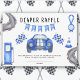 Race car theme baby shower invitation card featuring watercolor illustrations of a blue. "Race on over for a baby shower."