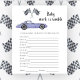 Race car theme baby shower invitation card featuring watercolor illustrations of a purple (violet) vintage car and black - white race flag. "Race on over for a baby shower."