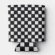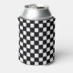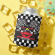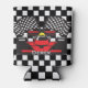 Red Race Car on Black and White Checkered Background Can Cooler with customizable text.