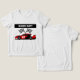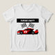 Celebrate your event or the recipient's love for race for racing with this custom name and number race car t-shirt. Black and white checkered flags sit behind the red, white, and black race car.