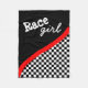 If you're a girl and you love auto racing then you'll love this fleece blanket featuring a black and white checkered pattern design with a red stripe on a black background.