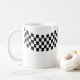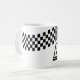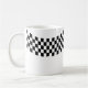 This ceramic coffee mug is shown in a racing flag print.