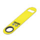 Bottle opener is shown in a bright yellow color with a racing flag print.