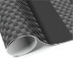 A crossed checkered racing flags applique rendered as a chrome like applique on a carbon fiber style design print. The carbon fiber and black stripes look suits automotive, modern, and industrial tastes and the 3D simulation of the flags makes for a dynamic looking design.