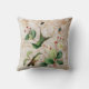 Square throw pillow design features a vintage illustration of the Booted Racket-tail hummingbird (Ocreatus underwoodii.) Two green hummingbirds perch on a myrtle plant with white flowers, on an off-white vintage grunge background with gold swirls and floral silhouettes.