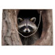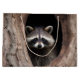 Cute young raccoon looking out from the inside of big tree.