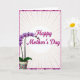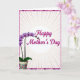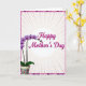 This design shows a potted flowering plant on the left, with arching stems that lean toward the message as if reaching out in a gentle, friendly gesture ❤️. The blossoms resemble an orchid, with petals shifting from soft lavender edges into a deeper pink center, giving the blooms a tender, affectionate look. On the right side, a short Mother’s Day message sits centered inside a pale beige oval, and the lettering is a rich magenta that stands out clearly. Behind everything, faint peach lines spread outward in a soft radial pattern, like warm morning light across the background. A detailed border wraps around the card with tiny floral shapes in deep purples and pinks, adding extra texture without crowding the scene. The plant pot carries a scattered pattern of small, abstract flowers in several bright tones, bringing in a cheerful garden feel 🌼. The overall layout keeps the plant on the left and the text on the right, framed by the floral border and the sunburst-like peach lines.