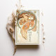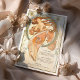 Celebrate your wedding with this radiant Art Nouveau-inspired menu card, a masterpiece of elegance and artistry. The front design features a captivating figure with flowing auburn hair, gracefully adorned in peach and gold tones, surrounded by intricate circular patterns in blue and gold. Delicate floral and leaf motifs enhance the romantic atmosphere, complemented by an elegant script for the menu on the back. This card is perfect for weddings with vintage, romantic, or pastel themes, offering an enchanting touch to your special day. Its harmonious color palette of peach, gold, ivory, and light blue creates a timeless keepsake.