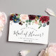 Chic floral bridal party proposal card features a top border of burgundy marsala, blush pink and navy blue flowers, with lush botanical foliage and greenery. Personalize with your maid of honor request details (shown with "will you be my maid of honor? I can't say I do without you") in modern hand lettered script and traditional sans serif lettering. Invitations reverse to rich jewel toned navy blue.