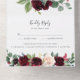 Our Radiant Bloom wedding invitation surrounds your wedding day details with a geometric frame of painted watercolor flowers in burgundy marsala, blush pink and navy blue, with green botanical foliage and eucalyptus leaves. A beautiful choice in lush, saturated colors for fall or winter weddings.