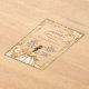 This quinceanera invitation features an elegant gold and cream theme with intricate lace-like borders, Radian Bloom floral accents, and delicate butterflies. At its center is an illustration of a girl in a luxurious gold-accented gown with Radiant Bloom flowers, adding a touch of grace and sophistication. The combination of script and serif fonts enhances its refined and celebratory style, perfectly suited for the occasion.