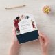Our Radiant Bloom wedding invitation surrounds your wedding day details with a geometric frame of painted watercolor flowers in burgundy marsala, blush pink and navy blue, with green botanical foliage and eucalyptus leaves. A beautiful choice in lush, saturated colors for fall or winter weddings, this design features a detachable RSVP section with a QR code for guests to scan.