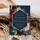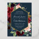 Our Radiant Bloom wedding invitation surrounds your wedding day details with a geometric frame of painted watercolor flowers in burgundy marsala, blush pink and navy blue, with green botanical foliage and eucalyptus leaves. A beautiful choice in lush, saturated colors for fall or winter weddings, with elegant gold foil trim to complete the look.