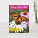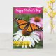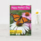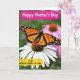 This card shows a large winged insect in warm orange and deep black resting gently on a white flower, its open wings edged with tiny white spots like careful lacework. The insect’s fine wing lines and the flower’s sunlit center feel close and intimate, as if the scene is sharing a quiet moment of care ❤️. Behind them, the garden fades into a soft blur of green with hints of pink, keeping your attention on the tender meeting of wings and petals. Light falls naturally across the petals and the insect’s body, bringing out soft textures and a calm, affectionate mood. At the top, a bright magenta ribbon banner holds the words “Happy Mother’s Day” in light-colored lettering that stands out clearly. Near the lower area, a golden yellow band carries the message “to an amazing mother in-law” in darker text, balanced neatly above the flower 🌼. The white petals spread outward beneath the banners, with the insect centered over the flower’s warm, textured core.