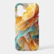 This abstract artwork captures the feeling of a flower caught mid-bloom, transformed into waves of light, color, and motion. Soft, translucent layers unfurl like delicate petals, blending warm golden yellows, amber tones, and coral hues with cool turquoise and deep teal shadows. The overlapping forms create a sense of depth and fluidity, as if the artwork is gently breathing or drifting through space.
