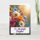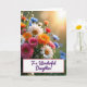 This card shows a full bouquet of mixed flowers arranged close together against a softly lit, dreamy background, with a gentle, affectionate mood in the way the blooms seem to lean toward one another ❤️. The colors focus on rich pinks, warm oranges, bright whites, and light blues, creating a cozy, friendly harmony across the scene. A golden light streams in from the upper right, giving the petals a tender glow and making the background sparkle with soft, out-of-focus dots like sunlit dew. The foreground flowers are sharper while the rest fades slightly, adding depth and an intimate, close-up feel. Along the lower portion sits a white rectangular panel edged with a thin pink border, neatly separating the message from the flowers. Centered on that panel, the words “To a Wonderful Daughter!” appear in purple, flowing lettering that stands out clearly against the white. A small cluster of blossoms overlaps the top edge of the panel, and a few pale blue petals and white blooms catch the warm light near the bottom left 🌼.