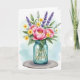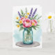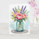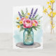 Designed with a generous bouquet as the main focus, this card features full pink blossoms with layered petals and sunny yellow centers that lean toward each other like close friends ❤️. Bright yellow accent flowers are tucked between the larger blooms, adding little sparks of warmth across the arrangement. Slender purple flower spikes rise through the greenery, giving the scene a gentle, calming balance. Mixed green leaves in several shades fan outward to frame the bouquet and add depth around the glass container. Near the middle of the jar, the text “Great Grandma” appears in golden lettering, standing out against the cool, aqua-tinted glass. The bouquet rests on a simple round gray base, while the background fades into soft washes of light blue and pale green with an airy watercolor feel 🌼. Subtle highlights on the jar suggest reflections along its curved sides, and the stems are faintly visible through the translucent glass.