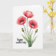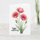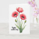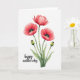 This card features a soft watercolor-style cluster of flowers set against a wide white background, giving the scene lots of airy space. Three fully open blooms take center stage in coral-red tones that shift from lighter to deeper shades, like a gentle blush shared between close friends ❤️. Each flower has a near-black center with a bright lime-green core, creating a strong focal point that draws the eye in. Slender green stems with slight texture rise upward, and a few long leaves in muted green sit near the base to ground the arrangement. Two rounded buds, olive-green with small crimson tips, stand beside the open flowers, adding a quiet sense of closeness and anticipation 🌼. The words “happy mother’s day” appear in the lower left in a flowing, understated style, written in a dark gray-green color that doesn’t compete with the flowers. The dark centers look almost velvety against the coral petals, while the lime-green cores glow sharply at the heart of each bloom.
