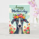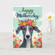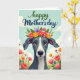 Designed with a serene portrait of a slender-nosed dog at the center, this card shows a dark gray coat with a white muzzle and chest, facing forward with warm amber eyes that feel gently attentive ❤️. A flower crown rests on its head, filled with coral, yellow, and purple blooms tucked among leafy greens, like a quiet thank-you wrapped in spring. Along the bottom, a soft green meadow rises with scattered blossoms in pink, orange, and blue, giving the scene a friendly, affectionate tone. Near the top, the words “Happy Mother’s Day” sit prominently, with “Happy” in green and “Mother’s Day” in deep blue, spaced evenly across the sky. The lettering is smooth and flowing, standing out clearly against the pale blue background without crowding the artwork. A few rounded white clouds drift behind the text, adding a calm, airy feel that pairs nicely with the floral details 🌼. The dog’s face is outlined with simple lines and gentle shading, and the sky remains a light blue with small, fluffy white clouds scattered across it.