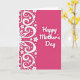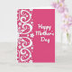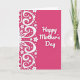 The front design shows a rich fuchsia-pink background that feels like a warm embrace ❤️. Along the left side, a tall white ornamental pattern curls upward in flowing lines, like lace-like vines that lean toward the open space as if reaching out. Tiny blossoms, small hearts, and neat round dots are tucked into the swirls, creating a gentle, affectionate rhythm that suggests closeness and care. The pattern looks like it could be part of a larger, balanced circle extending beyond the edge, adding a quiet sense of togetherness. On the right side, the pink area stays open so the message has room to breathe, like a calm pause between two friends. The words “Happy Mother’s Day” sit centered on the right half in smooth white lettering with a faint shadow that lifts it slightly from the background 🌼. The white motif includes petite flowers and heart shapes nestled among the curving scrolls and dotted accents.