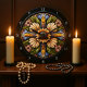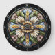 This exquisite wall clock showcases a stunning stained glass design with a prominent cross formed by a radiant sunflower and surrounding floral patterns. The intricate details and soft, pastel colors, including yellows, blues, and greens, create a serene and uplifting piece perfect for any home. Edit color of the clocks numbers in the Design tool to your favored colors.