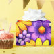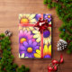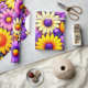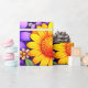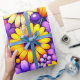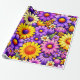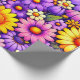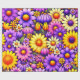 Bright floral blooms in yellow, purple, and orange spread across a rich background, forming a bold, layered composition with smooth petal shapes and vivid contrast. The saturated colors and repeating arrangement create a cheerful, festive visual that feels lively, decorative, and visually captivating.