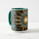 The image shows a symmetrical fractal pattern that resembles a flower or mandala. The central part of the pattern is bright, with light radiating and fading into darker tones towards the edges. The intricate design features multiple layers of petal-like structures with detailed textures and swirls, predominantly in shades of blue and brown with hints of gold. This design is visually captivating and perfect for a mug, combining geometric complexity and aesthetic appeal.