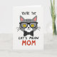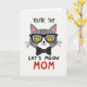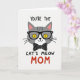 This card shows a friendly gray cat head centered on a white background, drawn with simple shapes and a sweet, knowing expression that feels like a gentle wink of friendship ❤️. The cat wears black-framed glasses, and its bright yellow eyes with narrow vertical pupils give it an attentive, affectionate look. A tiny black nose and small upturned smile sit above faint fur lines, while thin black whiskers spread out evenly on both sides. Under the chin, a neat black bow tie with small white polka dots adds a dressed-up touch, like it’s ready to charm someone special. The inner ears are tinted soft pink, warming the mostly gray, black, and yellow palette with a tender, caring tone 🌼. Text sits above the cat reading “YOU’RE THE” in casual black lettering, and below the face it continues with “CAT’S MEOW” in matching black. The word “MOM” appears beneath in large red letters, standing out strongly against the white space.