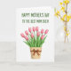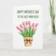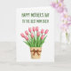 Designed with a bright white background, this Mother’s Day card centers on a botanical illustration that feels gentle and affectionate ❤️. Across the top, the message “HAPPY MOTHER’S DAY TO THE BEST MOM EVER!” is set in all caps in a friendly green typeface, standing out clearly above the artwork. Below the text, a clustered bouquet of about ten soft pink spring flowers rises together, their blush petals shaded lightly to suggest depth like a tender blush on a cheek. Slender green stems and leafy sprigs spread outward, giving the arrangement an easy, caring look, like a quiet hug in floral form 🌼. The blooms sit in a beige container with a woven texture, adding a cozy, homey touch to the scene. A simple brown ribbon wraps the container and ties into a neat bow near the front, adding a small detail that feels thoughtfully placed. The overall layout stays airy with lots of open space so the flowers and message feel close and focused. The final detail is the little bow’s two ribbon tails resting against the textured pot just beneath the pink blossoms.