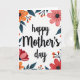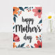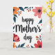 This greeting card features a white background with a floral frame that feels like a gentle hug around the message ❤️. In the center, the words “happy Mother’s day” appear in flowing, elegant lettering, set large and easy to read. The text is placed centrally with plenty of open space around it, helping the letters stand out against the light backdrop. Around the edges, four stylized flowers in orange, coral-pink, and deep red lean inward as if they’re admiring the message together. Dark teal leaves and stems weave between the blooms, adding contrast and a calm, steady balance. Small orange berry-like clusters dot the border like little sparks of celebration 🌼. The orange flowers show dark centers, and the foliage forms a loose rectangle framing the text.