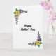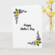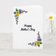 The front design shows a digital illustration on a bright white background with the message “Happy Mother’s Day” centered in thick black lettering that feels warm and close ❤️. Two floral clusters sit in opposite corners, creating a gentle diagonal flow that draws your eyes across the card like a quiet, caring exchange. Each cluster is outlined in black, with curling tendrils that sweep outward like an affectionate gesture. A golden-yellow flower with a deep green center anchors each corner arrangement, suggesting a steady, nurturing presence. Around it, soft lavender petals and light cream accents nestle among leafy greens, adding a calm, friendly tenderness 🌼. The contrast of black lines against the white space keeps everything easy to read while still feeling detailed and decorative. The text remains the focal point, with the flowers framing it from the corners without crowding the center. In each corner, the yellow bloom sits closest to the edge, with lavender petals and green leaves layered just inside the black curling flourishes.