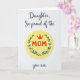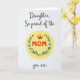This card features a bright white background with a sun-yellow circle centered like a glowing badge, setting a cheerful, affectionate mood ❤️. Inside the circle, the word “MOM” appears in strong red letters, giving it a confident, loving focus. A small red crown sits just above the word, as if gently honoring her with a sweet, proud touch. Around the circle, a leafy green wreath curves neatly, dotted with tiny white flowers that have warm orange-red centers, like little signs of care 🌼. Above the emblem, the line “Daughter, So proud of the” is written in dark, flowing cursive-style lettering, arcing lightly across the top. Below the emblem, “you are,” appears in the same dark, flowing lettering, balancing the layout and adding a soft, close-to-the-heart feel. The red, green, and yellow colors stand out crisply against the open white space, and the wreath’s small blossoms are spaced evenly around the circle.