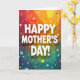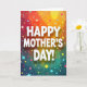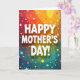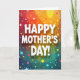 This greeting card features the centered text “HAPPY MOTHER’S DAY!” in large white sans-serif letters that stand out clearly against a glowing rainbow backdrop. Behind the words, the colors flow from reds and oranges near the top into sunny yellows and greens, then drift into blues and purples toward the bottom, creating a soft, radiant wash. Subtle prismatic shapes sit within the gradient like gentle light refractions, giving the background extra depth without stealing attention from the message. Scattered across the design are tiny stars in yellow, red, light blue, and green, along with small white dots that resemble confetti floating through the air. The overall look feels affectionate and celebratory ❤️, like a warm hug shown through color and sparkle rather than characters. The greeting stays firmly in the middle while the background seems to shimmer and move around it, adding a friendly, lively energy 🌼. Small star shapes and white speckles are sprinkled evenly from edge to edge across the entire frame.