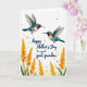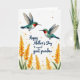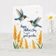 Designed with two small nectar-feeding birds in mid-flight near the top, the scene feels like a sweet exchange as they angle toward each other with a tender closeness ❤️. Their bodies glow in teal and emerald tones with white underbellies, and each has a bright red throat that draws the eye. The background is a soft off-white with a light texture, giving the birds plenty of airy space to hover. Along the lower third, tall flower spikes rise in golden orange and soft yellow, surrounded by leafy green stems that add a gentle, nurturing feel 🌼. Small specks of orange and deep red drift across the open space like scattered pollen, adding warmth without crowding the design. Centered over the open middle area, dark blue flowing lettering reads, “Happy Mother’s Day to a special great grandma,” standing out clearly against the pale backdrop. The dark blue text sits above the flowers while the birds hover above it, and tiny orange and red flecks are sprinkled around the off-white background.