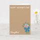 Designed with a warm tan background, this Mother’s Day card keeps the layout simple while letting the message shine. Across the top, “HAPPY MOTHER’S DAY” appears in crisp white lettering, spaced neatly so it feels open and easy to read. Near the lower-left corner, the word “Daughter!” is written in flowing white lettering, like a gentle signature that adds closeness ❤️. The lower-right becomes the main focus with a stylized bouquet that looks like pinwheels or sweet treats, giving the flowers a friendly, affectionate charm. Round blooms show radiating stripes in pink-and-white, blue-and-white, and yellow-and-white, suggesting a bright, caring energy without needing extra decoration 🌼. Green leaves and small pink starburst accents fill out the arrangement, creating the sense of a thoughtful gift held out with a tender intention. A deep blue ribbon is tied into a bow around the slim green stems, anchoring the cluster with a strong pop of color. The illustration stays flat with no heavy shading, and the bouquet sits clearly in the lower-right against the tan field.