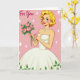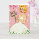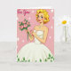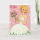 Designed with a classic mid-century look, this card features a glowing woman centered on a soft pink background, her blonde curls framing bright blue eyes, rosy cheeks, and a friendly smile ❤️. She wears a white strapless gown with a full skirt, and small green leaves decorate the hem as if nature is gently tagging along. A pale blue pendant and matching stud earrings add a light sparkle near her neckline. Her red-painted nails cradle a bouquet of pink roses, and the way she holds them forward feels like a sweet offering to someone she cares about. In the upper left, the words “For You” appear in flowing cursive lettering in white, floating above her shoulder. Tiny white starburst shapes are sprinkled across the pink backdrop, giving the scene a light, celebratory touch 🌼. The roses show layered pink petals with deep green leaves, and the dress folds are shaded to suggest soft volume against the flat background.