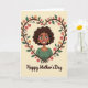 The front design shows an illustrated woman with dark, full curls framing bright blue eyes and a wide smile, with a soft rosy tint on her cheeks that feels welcoming ❤️. She wears small golden drop earrings and a delicate beaded gold necklace above a muted sage-green top, giving her a gentle, polished look. Around her, a heart-shaped vine wraps like an affectionate hug, suggesting closeness and care through its curling stems. The leafy border mixes several greens with a few warmer, autumn-toned leaves, dotted with round, stylized flowers in soft pink and orange 🌼. Everything sits on a creamy light-yellow background that keeps the scene light and sunny. Below the portrait, a short Mother’s Day message appears centered near the bottom in flowing cursive-style lettering, set in a darker contrasting color for easy reading. The heart outline is formed by intertwined green vines, with pink-and-orange circular blossoms spaced evenly along the curve.