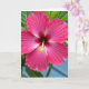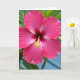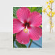 This card features a close-up flower filling the front, with petals shifting from bright pink at the edges to deep red toward the center, like a gentle pull inward that feels quietly romantic ❤️. The wide petals curve outward in soft waves, and faint vein lines add texture, as if they’re reaching toward one another in a tender, welcoming gesture. Near the middle, small white streaks lighten the pink tones, giving the bloom a glowing, almost translucent look. A single pale red stem rises from the center, topped with tiny yellow tips that sparkle like little stars. The lighting is soft and even, smoothing the curves without strong shadows and keeping the mood calm and affectionate. The greeting text sits along the top in white lettering, and a smaller line of text rests near the bottom in a warm yellow tone 🌼. Around the blossom, green leaves form a subtle frame, and the background fades into a blurred blue wash that suggests open daylight.
