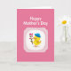 Designed with a soft rosy-pink background, this card sets a gentle, affectionate tone right away ❤️. Near the top, the words “Happy Mother’s Day” appear in rounded white lettering, centered and easy to read. Below the text sits a small yellow bird-like character with big dark eyes and lightly rosy cheeks, giving a tender, thankful look. A soft-edged white frame surrounds the character, trimmed with tiny dotted accents that add a delicate touch. On its head is a small blue hat, tilted slightly for a friendly, charming feel. One wing lifts a thin brown stem as if offering it with care, like a quiet gesture of closeness 🌼. Three fuchsia-pink blossoms with small green leaves bloom along the stem, standing out against the white frame and pink field. The flowers sit just to the side of the character’s raised wing, with the petals drawn in rounded shapes and shaded pink tones.