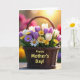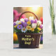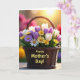 This card features a dark brown woven basket filling the lower half of the design, overflowing with spring flowers that lean toward each other like close friends ❤️. White and deep purple tulips rise above the rim, mixed with white and pale lavender daisy-like blooms and small clusters of sunny yellow flowers 🌼. Deep green leaves and stems weave between the petals, adding contrast and a cozy, garden-fresh feel. The background fades into a soft golden glow with blurred circles of yellow, pink, and green light, like early morning sunshine. Across the front of the basket, the words “Happy Mother’s Day!” are placed prominently in warm golden lettering that stands out against the darker weave. Light catches the petals and edges of the basket, giving the scene gentle depth and a calm, affectionate mood. The basket’s tight weave and the layered blossoms sit against a dreamy, softly glowing backdrop with pastel bokeh.