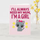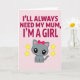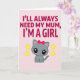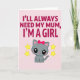 This card features a soft pastel pink background with a sweet, affectionate tone ❤️. Across the top, the message “I’LL ALWAYS NEED MY MUM, I’M A GIRL” sits in large fuchsia letters, centered and easy to spot. Below the words, a cute grey kitten with oversized glossy black eyes and tiny white highlights gazes forward with an innocent, tender look. Its inner ears are light pink, its cheeks are rosy, and a cherry-red bow on its head adds a flirty pop of color that feels like a little hug from mum. On either side of the kitten, two five-pointed yellow stars with subtle golden edging add a gentle sparkle, like warm encouragement in the air 🌼. The simple illustration style keeps the focus on the kitten’s soft expression and the caring message above it. The stars sit symmetrically to the left and right of the kitten, floating against the blush background.