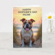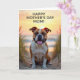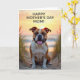 Designed with a stout, friendly-looking dog centered in the scene, the card shows it standing on a sandy path with a tender, welcoming gaze that feels like a quiet hug ❤️. Warm sunrise-or-sunset light pours in from the horizon, forming a soft halo around the dog’s head and ears and tinting the air in golden tones. Coastal grasses and low plants edge the path, and the background fades into a calm stretch of water beneath a glowing sky. The dog’s caramel-and-white fur catches the light, and its dark eyes sparkle as it smiles with a small pink tongue showing, as if sharing an affectionate moment with the viewer. Near the upper portion of the design, the message “HAPPY MOTHER’S DAY MOM!” sits clearly against the bright sky in light-colored lettering that stands out from the warm backdrop 🌼. The overall look stays gentle and romantic through the soft focus and the way the dog’s expression meets you head-on. Fine grain in the foreground sand is visible, while the distant shoreline and clouds blur into a warm, luminous gradient.