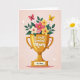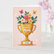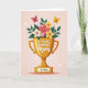 Designed with a soft pink gradient background, this illustration features a shiny golden trophy centered like a proud gift of affection ❤️. The cup gleams with gentle highlights and is filled to the brim with a lush bouquet in creamy white, sunny yellow, and several shades of pink, tucked among deep green leaves. The flowers spill over the rim in a way that feels like an embrace, as if the arrangement is leaning forward to greet someone close. Tiny star shapes and small red star accents are scattered around the backdrop, adding a light, dreamy sparkle without taking attention from the centerpiece. Two small winged creatures hover above the bouquet—one coral and one golden-yellow—tilting toward each other as if sharing a quiet, friendly moment 🌼. Across the front of the trophy, a flowing line of text sits in a darker gold tone, with a shorter line of text placed neatly on the base in a similar color. The trophy’s handles curve outward on both sides, and the bouquet rises above the rim with layered petals and leaf clusters.