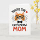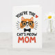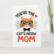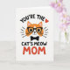 This card shows a friendly orange cat face centered on a bright white background, drawn with smooth outlines and a gentle, affectionate expression ❤️. The cat has a white muzzle, a tiny pink nose, and a small smile that feels like it’s meant just for someone special. Black-rimmed glasses and a neat black bow tie give it a sweet, put-together look, like it’s dressed up to impress. Short radiating lines on both sides of the face add a cozy “you’ve got my attention” kind of glow that reads like warm admiration. The text wraps around the cat in thick black letters, with “YOU’RE THE” arcing above and “CAT’S MEOW” placed below in the same dark tone. The final word “MOM” sits underneath in raised-looking red lettering, standing out as the main focal point, with a small red heart near the upper wording 🌼. The palette stays simple—orange, black, white, and red—with the heart icon floating near the top text and the bow tie tucked just under the chin.