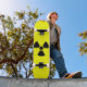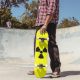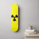 Skateboard deck with radioactive symbol on it.